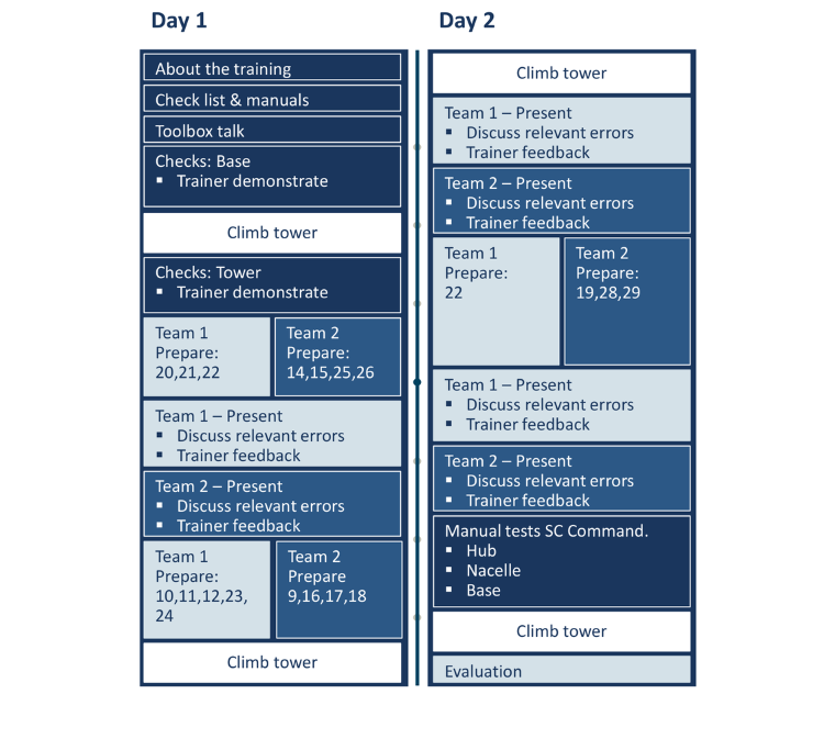During 2 days of training, we will utilize the OEM maintenance documents. The training will commence with the Trainer leading the demonstration of each check. Subsequently, participants will ascend to the nacelle and be divided into two teams.